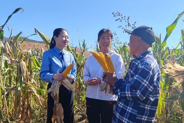 ▲王作英代表(中)与检察官实地查看玉米收成产量,了解韩某生活近况。